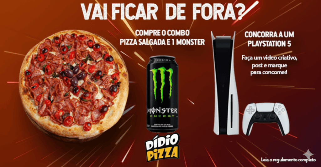 2.2. Abrangência: válida em todo o território nacional, para compras realizadas nas lojas Dídio Pizza participantes (físicas, telefone, app próprio ou marketplaces quando houver a oferta conjunta do combo) durante o período indicado. A disponibilidade do energético Monster pode variar por unidade.